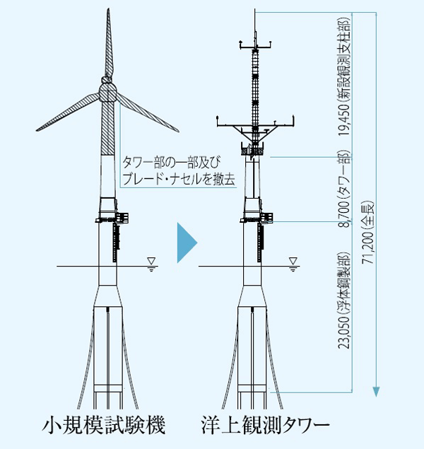 形状寸法: | 全長 172m (喫水:76m、ハブ高さ:56m、ロータ直径:80m) 浮体直径 最大 7.8m タワー直径 最大 4.8m |