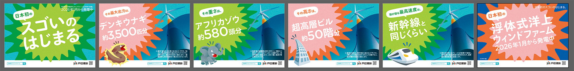 “浮かぶ”風車が、きっと未来を“ウキウキ”させる。脱炭素社会の実現と、地域社会への貢献を目指す、戸田建設の姿勢を伝えています。