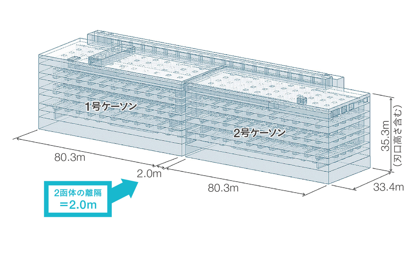1函当たり幅33.4m×延長80.3m×高さ35.3mの鉄筋コンクリート造の函体(ケーソン)は、地上で構築した後、地下に沈められた