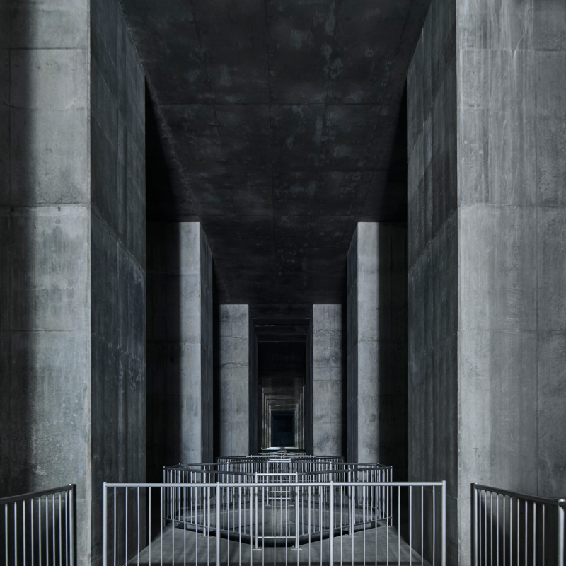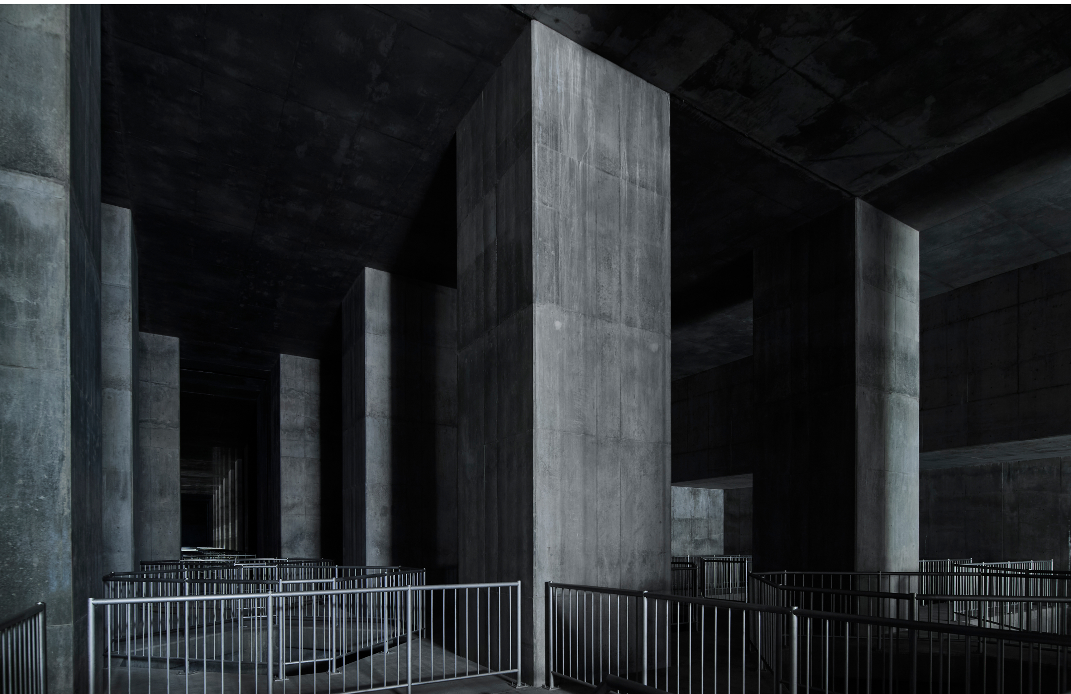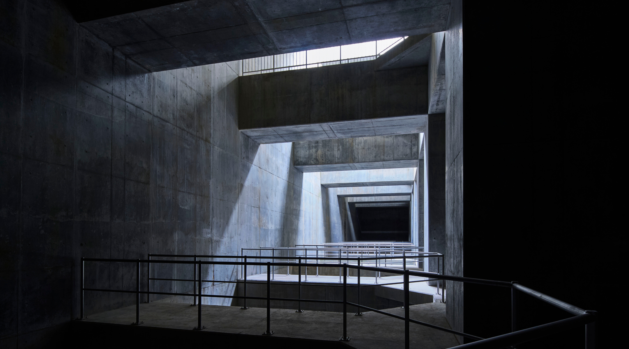 取水口内部の空間。越流堤(斜面)を越えた水は、右側のスクリーンで流木等の侵入を防止し、調節池内部に取り込まれる