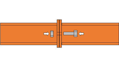 - 2従来の鋼製支保工の接合は、作業員が切羽直下に立ち入り横断方向にボルト・ナットで接合(図2)しますが、本システムでは左右H形鋼の継手部にせん断ピン付きみぞ形鋼を配置し、前後方向で重ね合わせ、切羽正面からボルト締め付け作業ができる構造としています(図3、4)。 本接合方法において、みぞ形鋼はH形鋼の凹部に収まり、曲げモーメント作用時に継手部の変形を拘束するとともに、4本のせん断ピンが曲げモーメントを伝達する機能によって従来接合と同等以上の強度性能を発揮します。また、両端部のせん断ピンを長くすることで、重ね合わせて組み立てる際のガイドピンとしても機能します。
