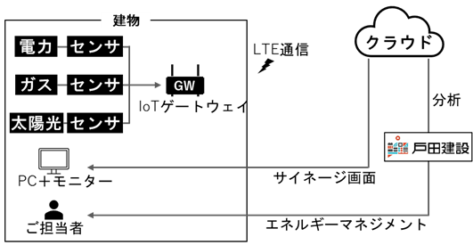 本システムは建物に取り付けたセンサ等で計測した電力量やガス消費量、太陽光発電量といったエネルギー情報をIoTゲートウェイ経由でクラウドに蓄積します(図1)。蓄積したデータはサイネージと分析のそれぞれの機能で利用します。