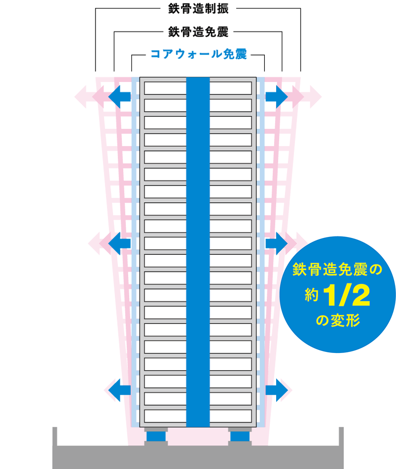 コアウォールが建物の心棒となり、上層階まで揺れと変形を大幅に低減します。