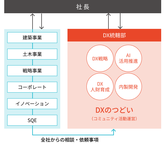 戸田建設のDXでは、現場や各部門との対話を重ねながら、一人ひとりの知見・ノウハウを全社的な価値へとつなげていくための環境づくりを大切にしています。その舵取りを担う社長直轄のDX統轄部が中心となり、縦割りの組織を横につなぎ、全社のDXを「整流化」する体制を構築しています。