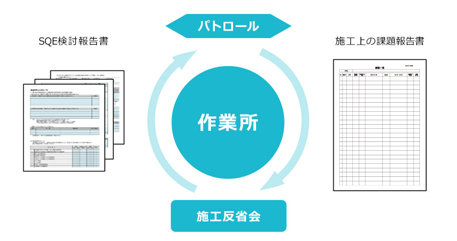 本社・支店が参画する受注時・着工時及び事前・中間時の「SQE検討会」(安全・品質・環境)で、施工上の課題の抽出と対応策の検討を行っています。抽出した課題は、問題解決に至るまでの過程を「施工上の課題報告書」で管理し、不具合発生の芽を摘む活動と位置つけています。