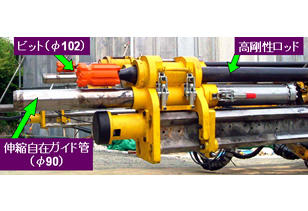 ドリルジャンボに専用装置を装着します。 - 高剛性ロッドにより直進性を確保します