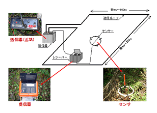 地表に設置した数m~100mの送信ループに断続電流を流すことによって生じる磁場の変化を、センサとレシーバーでとらえ、地下の比抵抗値を測定します。